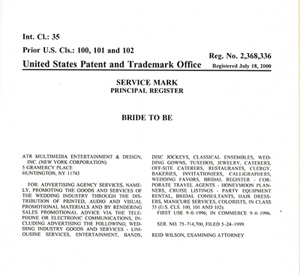 Bride To Be ® -  Reg. No. 2,368,336 - United States Patent and Trademark Office Registered Sept 1, 1996  -  Int. Class.: 35 - Prior U.S. Cls: 100,101,102 - First date of use Sept 1, 1996.  The International Trademark for Bride To Be ® and domain name BrideToBe.com® are now available as an exclusive lease, license and/or purchase.