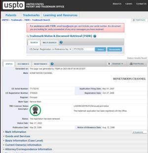 Honeymoon Channel ® -  Reg. No. 3,702,020 - United States Patent and Trademark Office Registered Oct 27,2009  -  Int. Class.: 35 and 39 - First date of use 6-13-1998.  The International Trademark for Honeymoon Channel ® and domain name HoneymoonChannel.com® are now available as an exclusive lease, license and/or purchase.